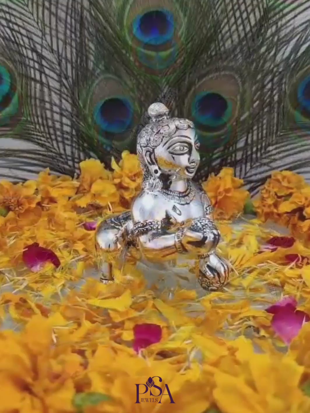 "Embrace the divine innocence and playful charm of Lord Krishna as Ladoo Gopal with our Pure Silver Bal Gopal Krishna Idol. Capturing the essence of Krishna's childhood antics and divine grace, this exquisite masterpiece radiates joy, love, and spiritual fulfillment. Crafted with intricate detail and sterling silver craftsmanship, the idol embodies the sweetness of Krishna's presence. Invite the auspicious blessings of Bal Gopal into your home and experience a sense of divine love and protection. Embrace the divine essence of Krishna's childhood form with this timeless masterpiece, elevating your spiritual journey to new heights."