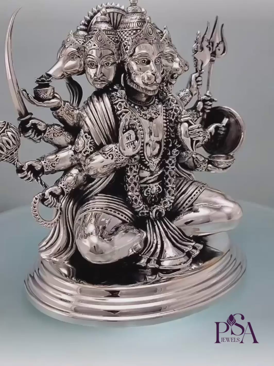 ""Discover divine craftsmanship with our Pure Silver Panchmukhi Hanuman Idol. Crafted with precision and reverence, each detail embodies the essence of strength and devotion. Invite the blessings of Lord Hanuman into your space with this exquisite sterling silver masterpiece."